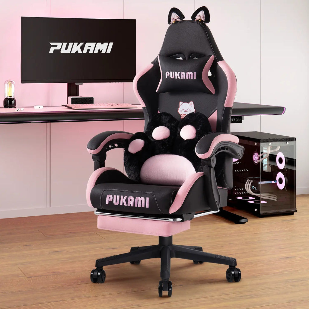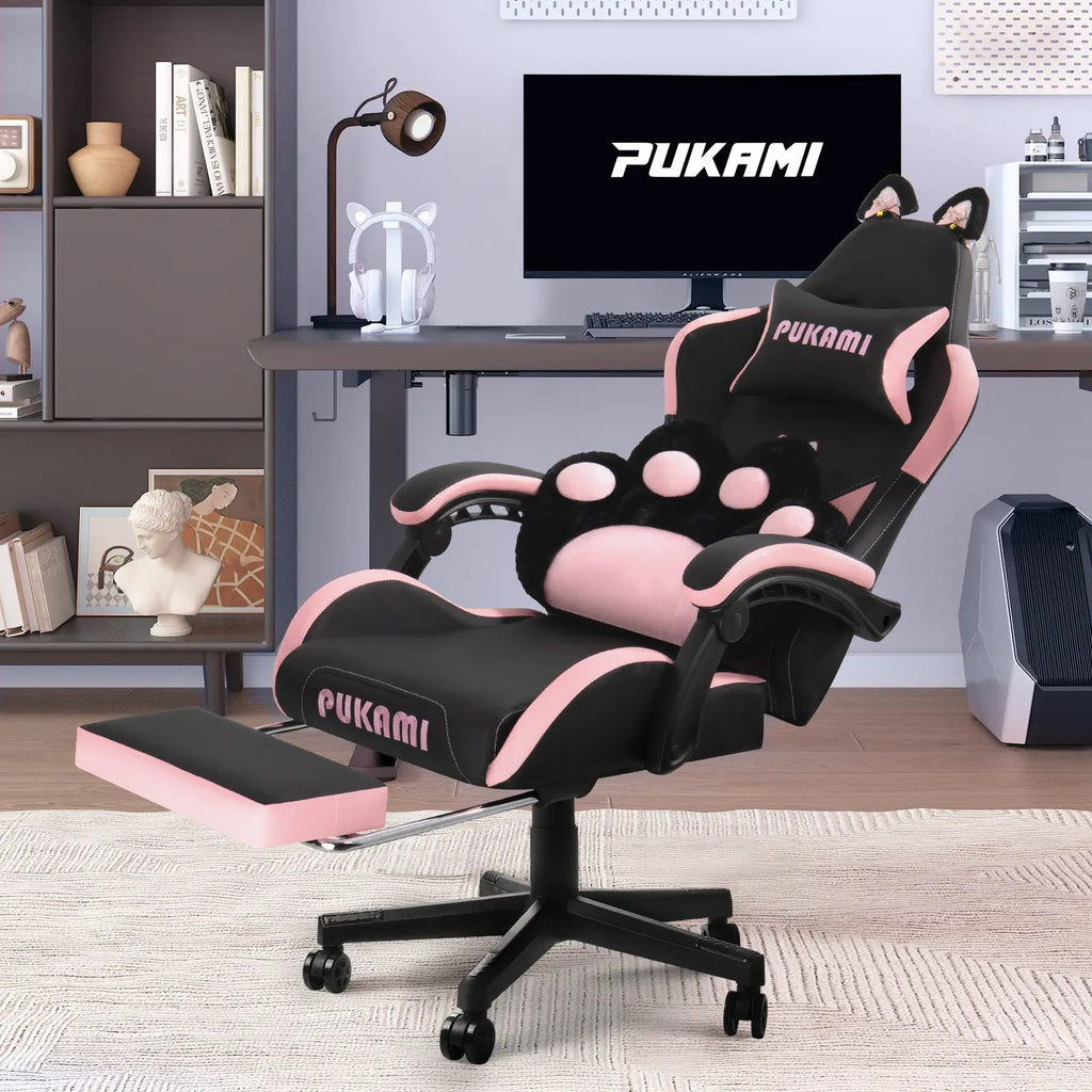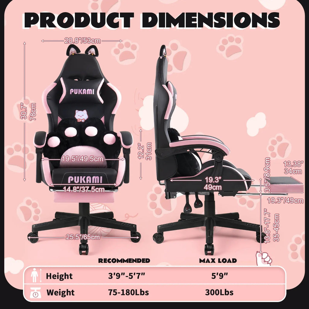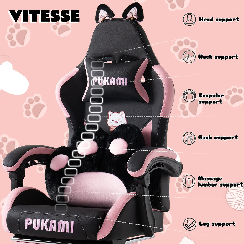 Super Cute: We've added cute cat ears to this gaming chair by replacing the regular lumbar pillow with a cat paw shaped lumbar pillow, and the cat head embroidery on the backrest makes the chair even more vivid and cute. The cat ears are removable, so you can replace them with your favourite decorations