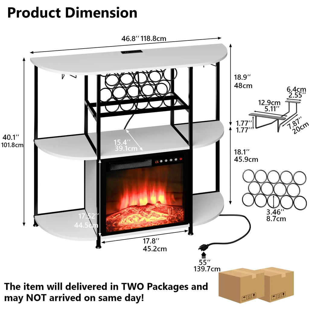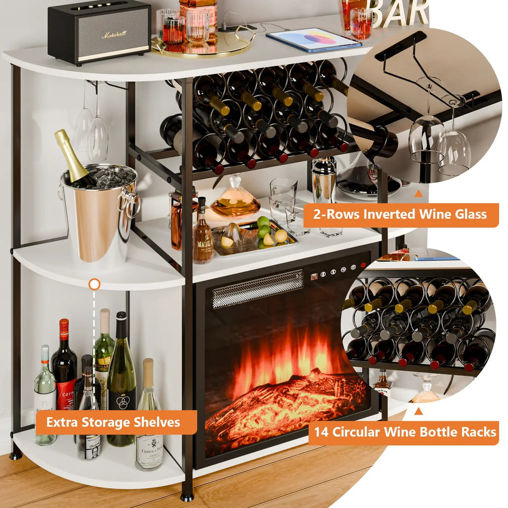 Large Storage Space:The mini bar has three dividers, 14 wine racks and 2 rows of glass shelves to provide you with plenty of storage space, and the top 110lbs of weight capacity allows you to place equipment such as an ice maker or coffee maker. The built-in fireplace can be removed at any time, so when you don't need to use the fireplace for a while, you can temporarily remove the fireplace for your own belongings. It can be used as a bar cabinet, wine rack table, coffee bar, wine cooler or buffet table to meet your different needs!