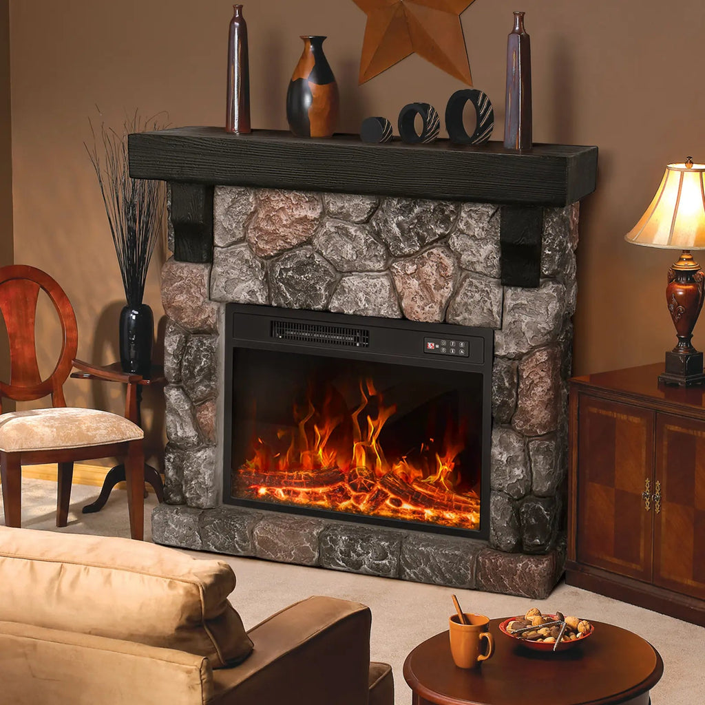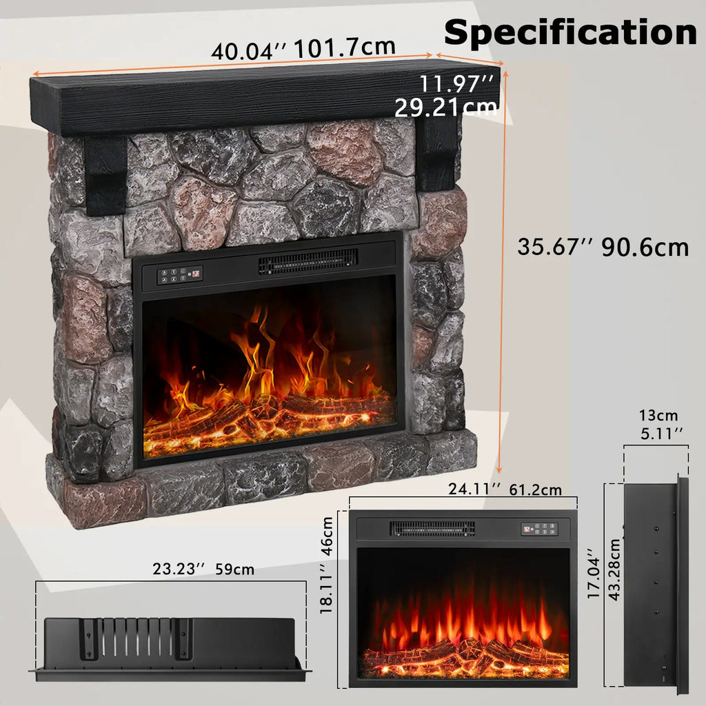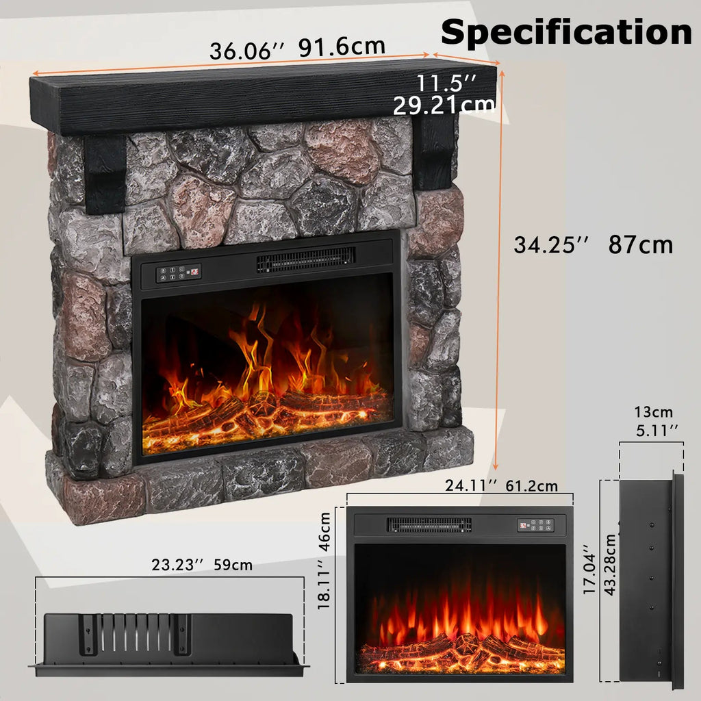Realistic Faux Stone Fireplace Frame: This fireplace frame features an elegant stone veneer and desirable wooden accents, providing both a tactile and visual experience akin to a genuine stone. Dimension:11.5"D x 36.06"W x 34.25"H