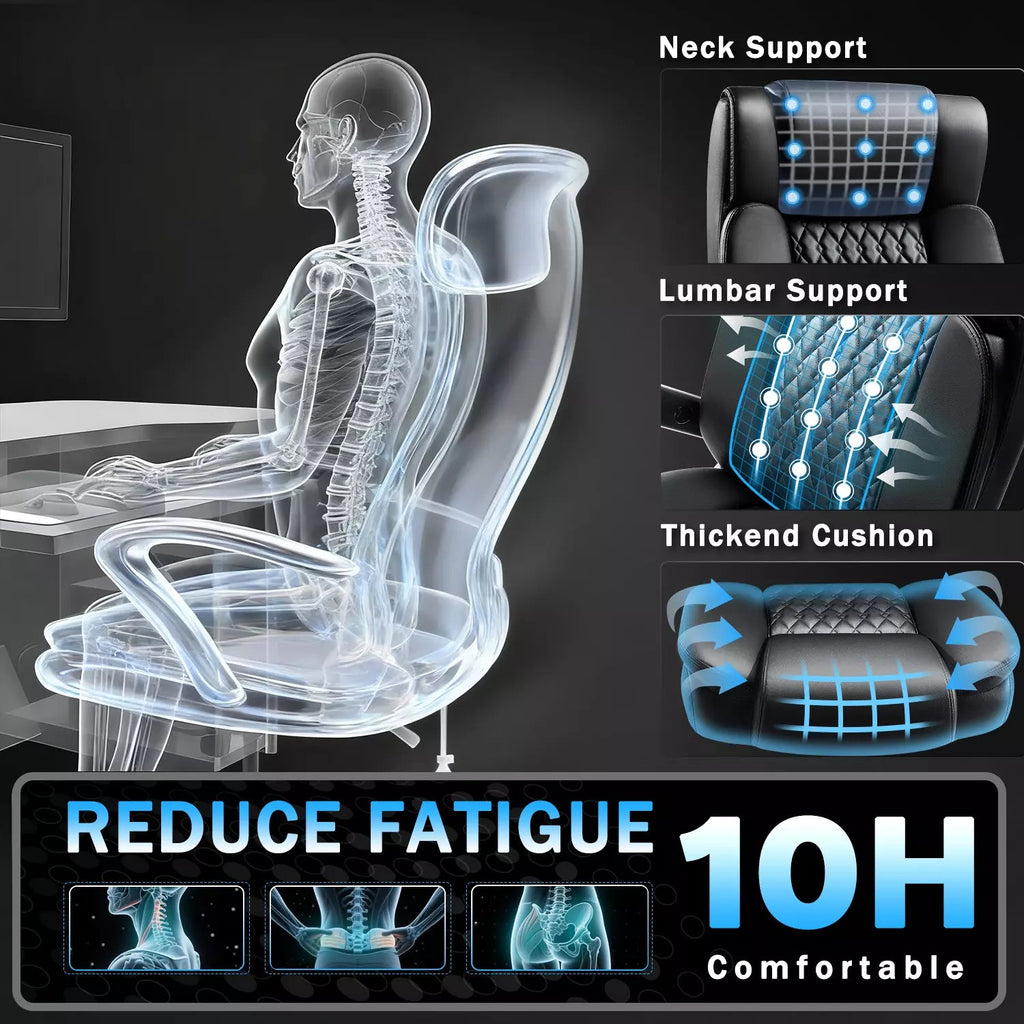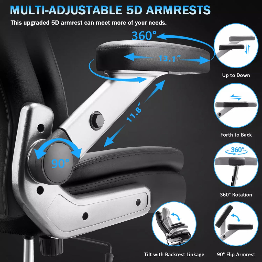 5D Adjustable Armrests: The executive chair adopts upgraded 5D adjustable flip wide area armrests, 360°swivel armrest surface, front and back can be adjusted 2.36'', up and down translation can be adjusted 2.56'', 90°turned easily into the table under the space-saving and beautiful, and the back can be linked to the back tilt to give your elbow a better support.