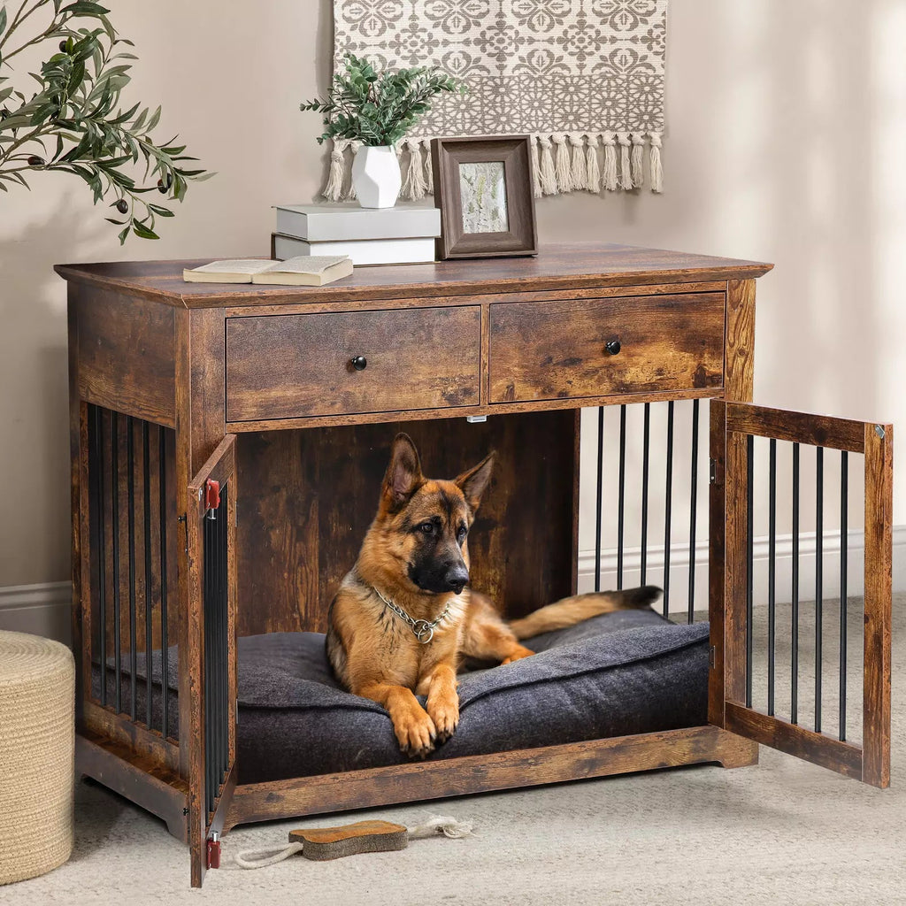 Large Table Top & Storage Drawer: The top panel of the dog cage is large and sturdy, and can hold up to 150 lbs, perfect for displaying home decorations such as plants, magazines, and family photo frames. And below the countertop are two large drawers, you can store dog food, snacks, toys, etc. Under the drawers is the exclusive space for the dog