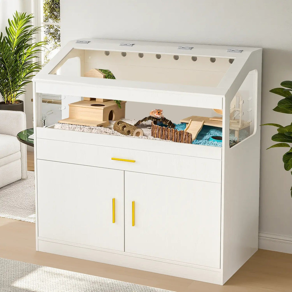 Superior Airflow & Crystal-Clear View: Designed with multiple acrylic panels, this cage and storage cabinet combination ensures your hamster's home is always fresh and visible. Each side panel features nine ventilation openings, complemented by eight more on the back, for excellent air circulation. Meanwhile, the clear panels offer an unobstructed view, making it easy to keep an eye on your furry friend's adventures.